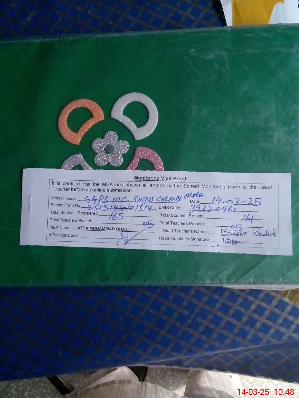 | Certified that this School was Inspected by the Undersigned MEA/DMO Today and the Information Stated Above is as Per Record. | |||||