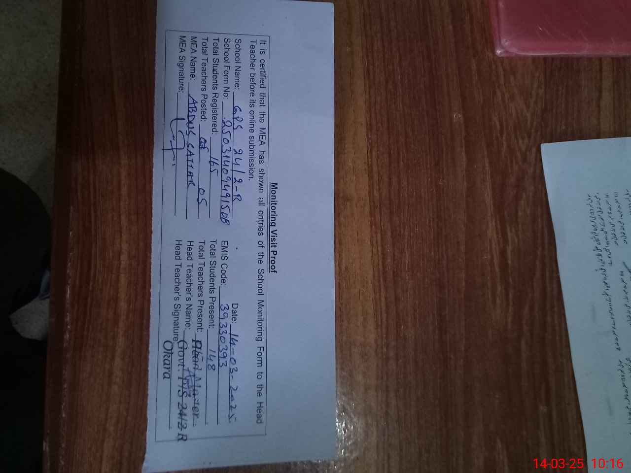 | Certified that this School was Inspected by the Undersigned MEA/DMO Today and the Information Stated Above is as Per Record. | |||||