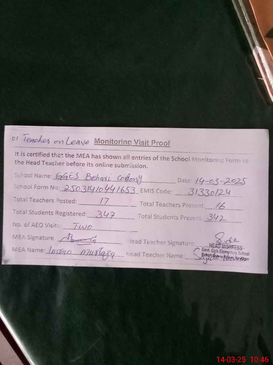 | Attendance Register | Head Teacher | MEA with School | Visit Proof |