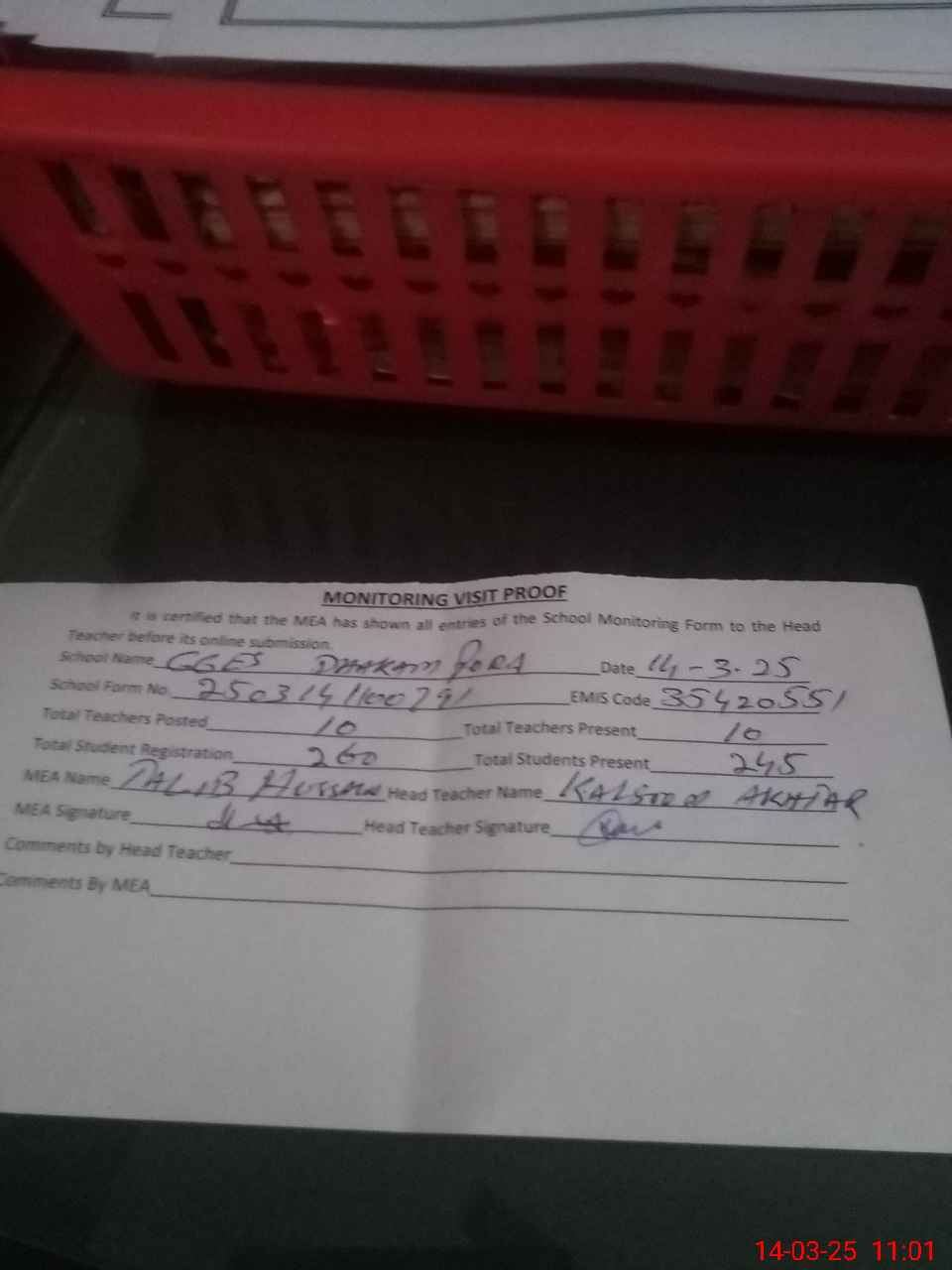 | Attendance Register | Head Teacher | MEA with School | Visit Proof |