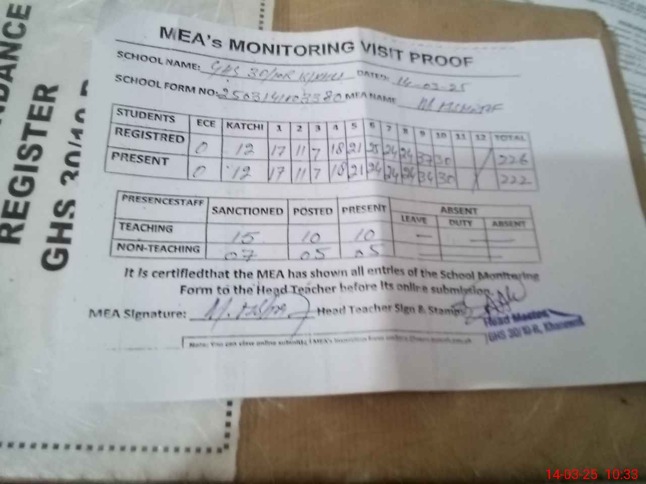 | Attendance Register | Head Teacher | MEA with School | Visit Proof |