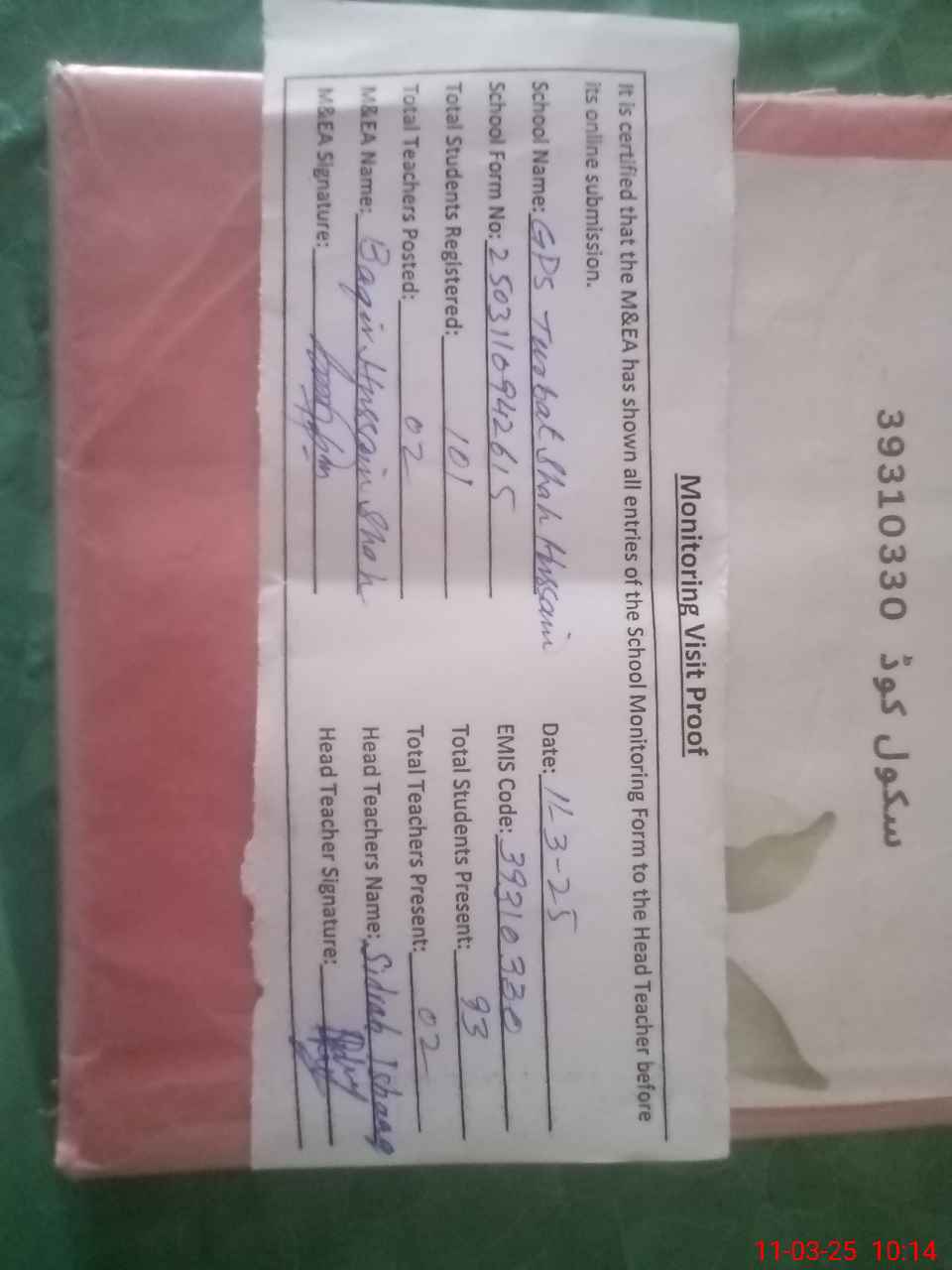 | EMIS Code: 39310330 | Name of School: GPS TURBAT SHAH HUSSAIN | |||