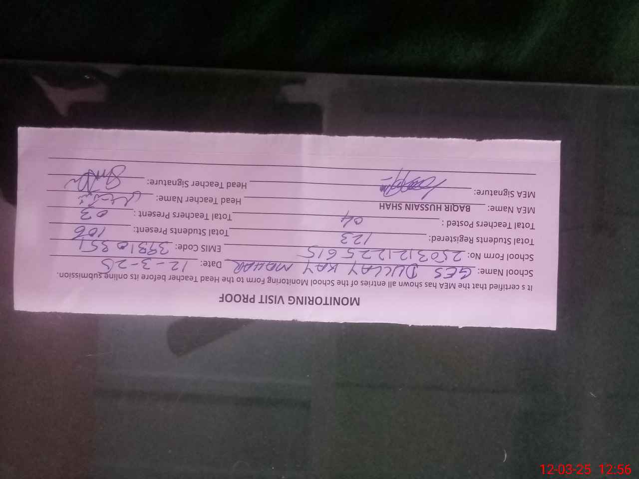 | Attendance Register | Head Teacher | MEA with School | Visit Proof |