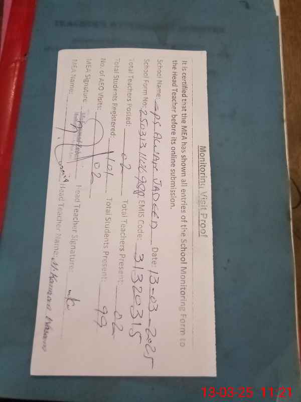 | Attendance Register | Head Teacher | MEA with School | Visit Proof |