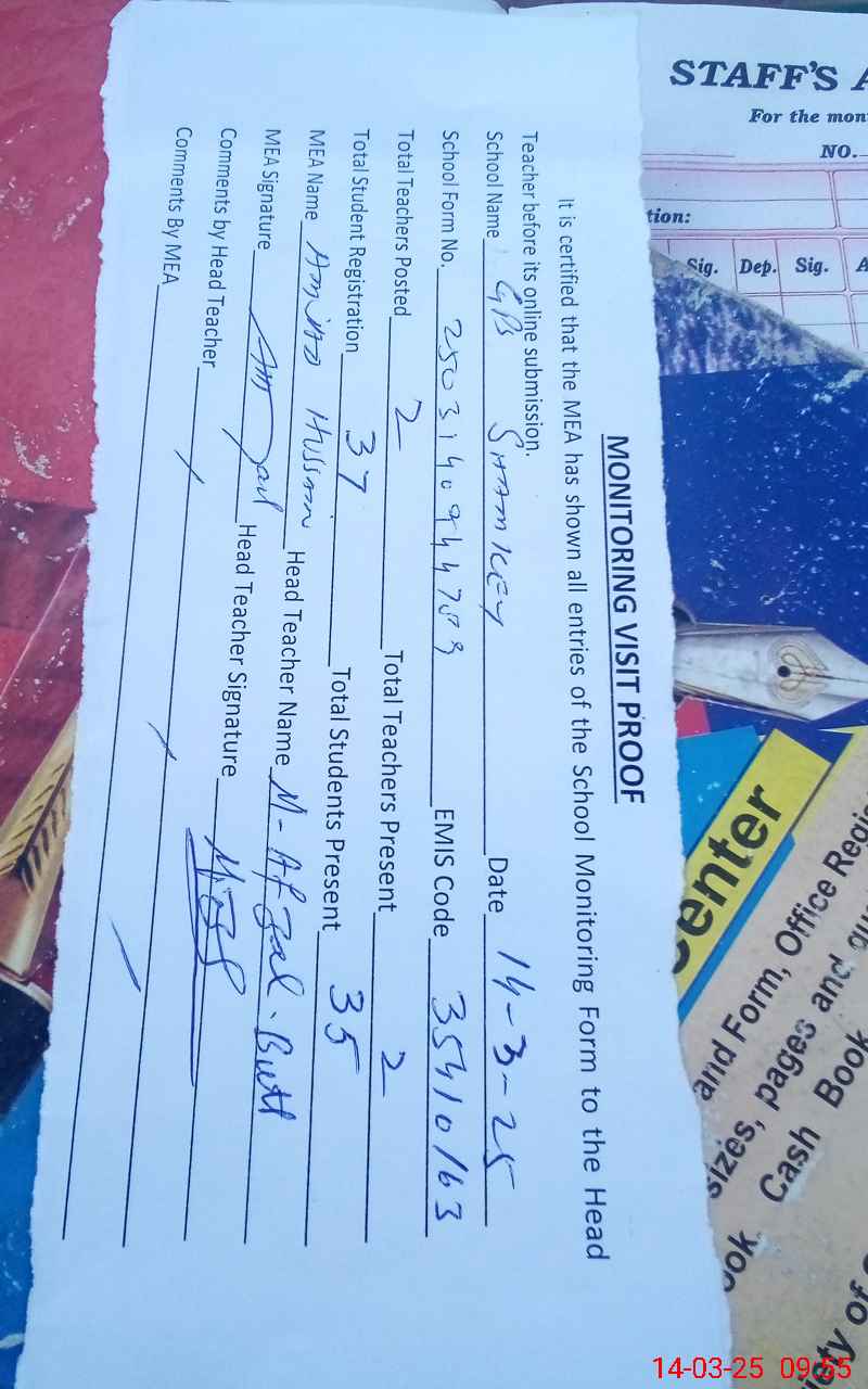 | Attendance Register | Head Teacher | MEA with School | Visit Proof |