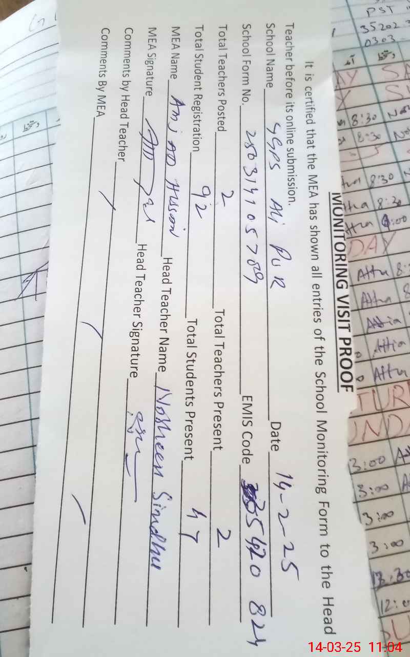 | Attendance Register | Head Teacher | MEA with School | Visit Proof |