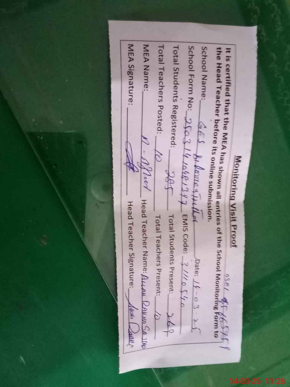 | Attendance Register | Head Teacher | MEA with School | Visit Proof |