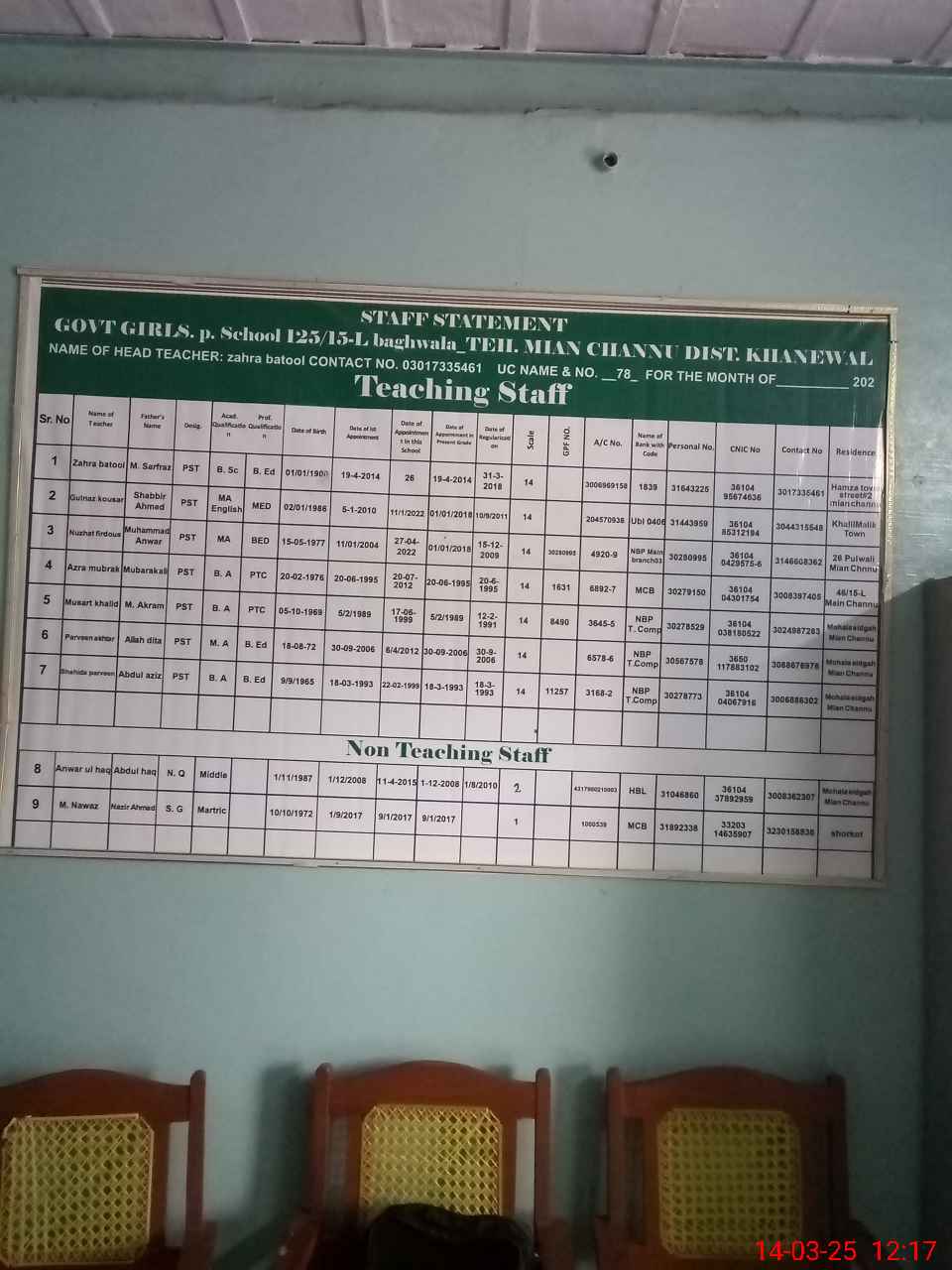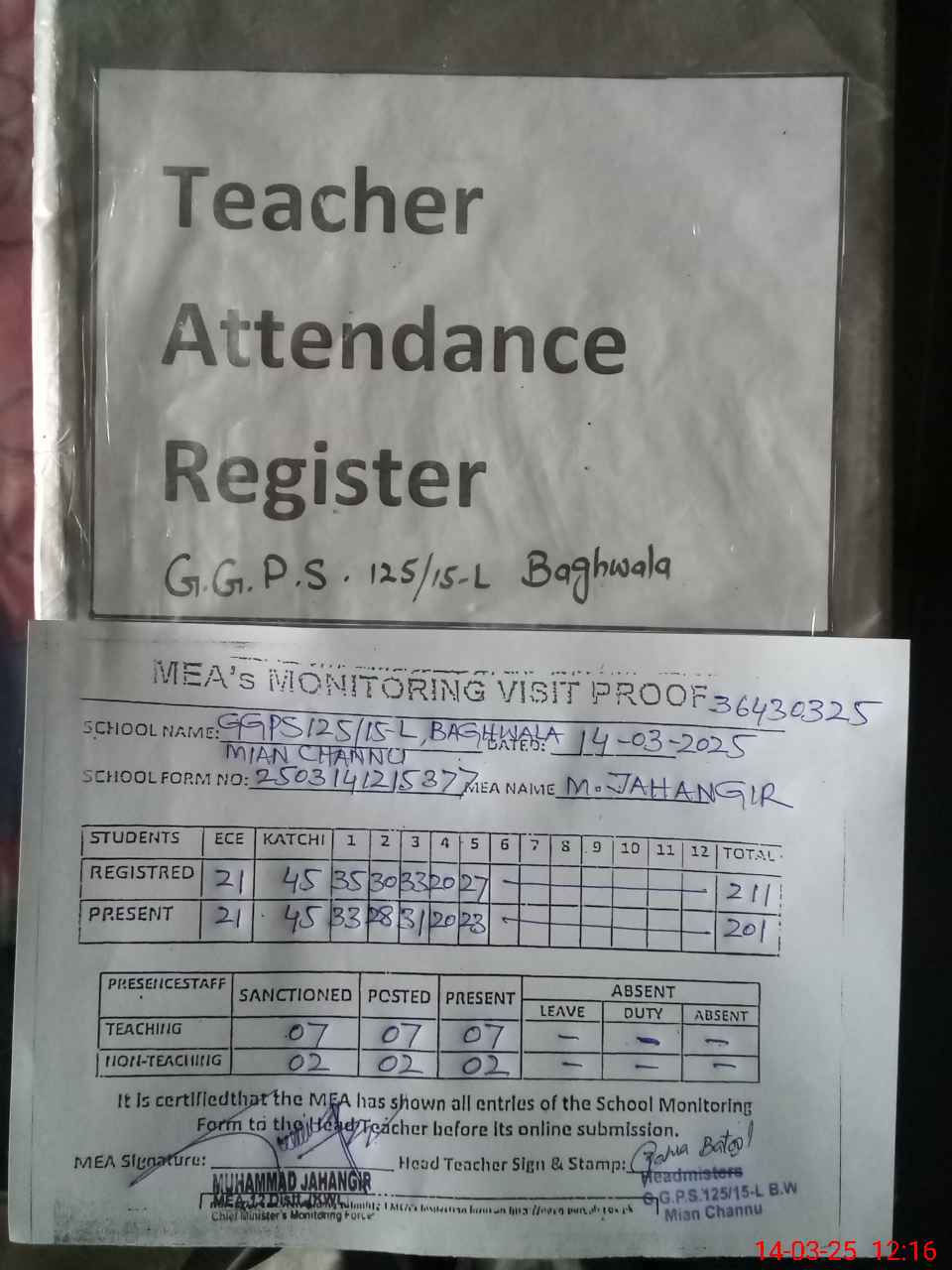 | EMIS Code: 36430325 | Name of School: GGPS 125/15-L BAGH WALA, MIAN CHANNU | |||