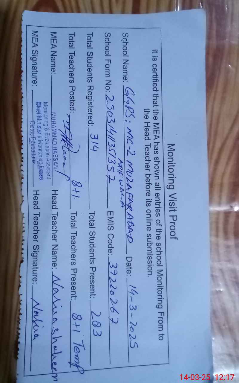 | EMIS Code: 39220267 | Name of School: GGPS MC NO. 2 MUZAFAR ABAD | |||