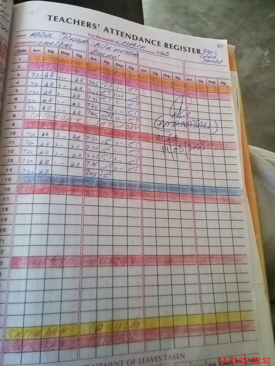 | Remarks (Use Separate Page if Required): PST Riffat Sattar went on Exam duty WEF 7 th March 2025 with out Order So She marked an absent from School | |||||
