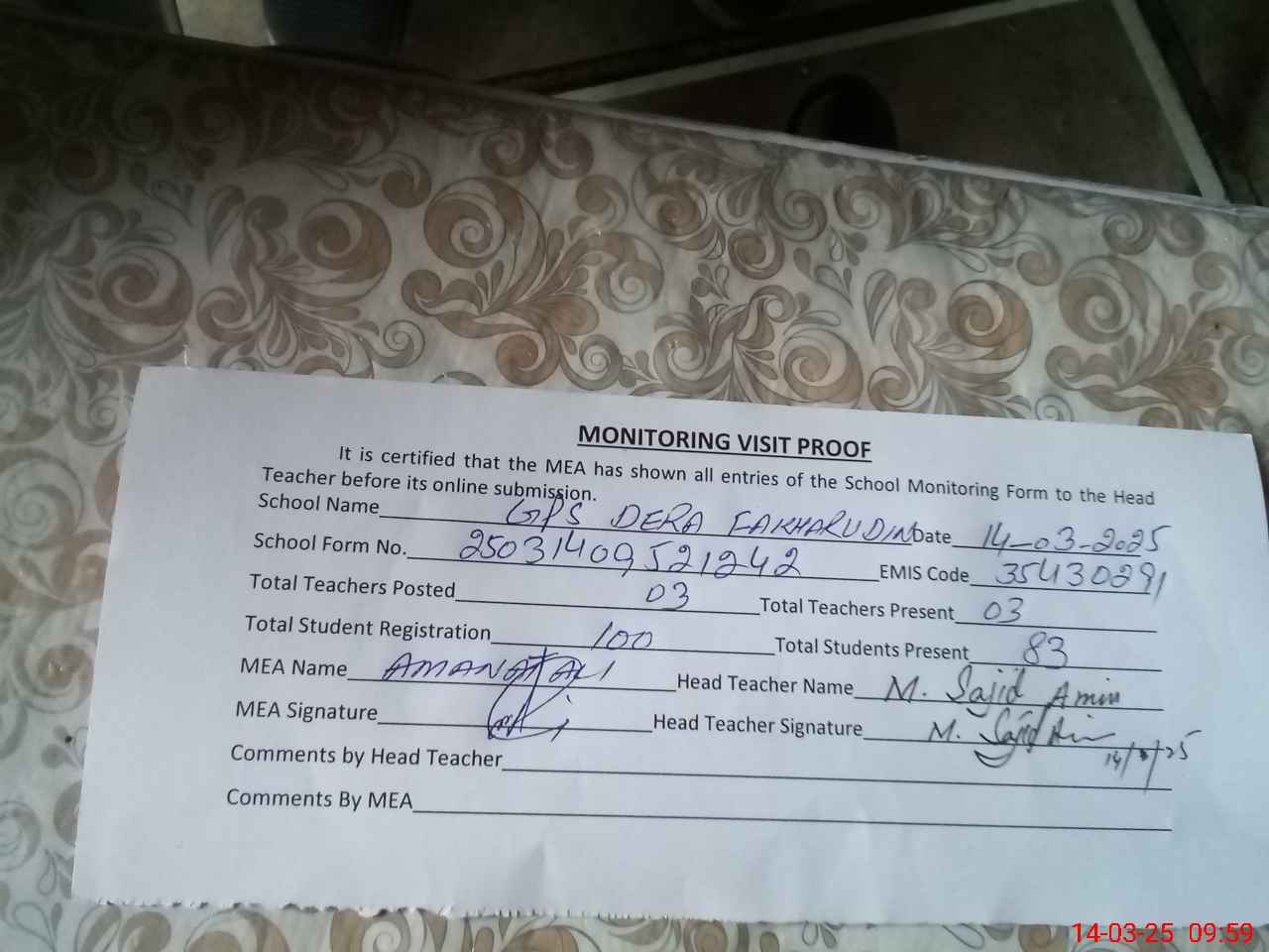 | Attendance Register | Head Teacher | MEA with School | Visit Proof |