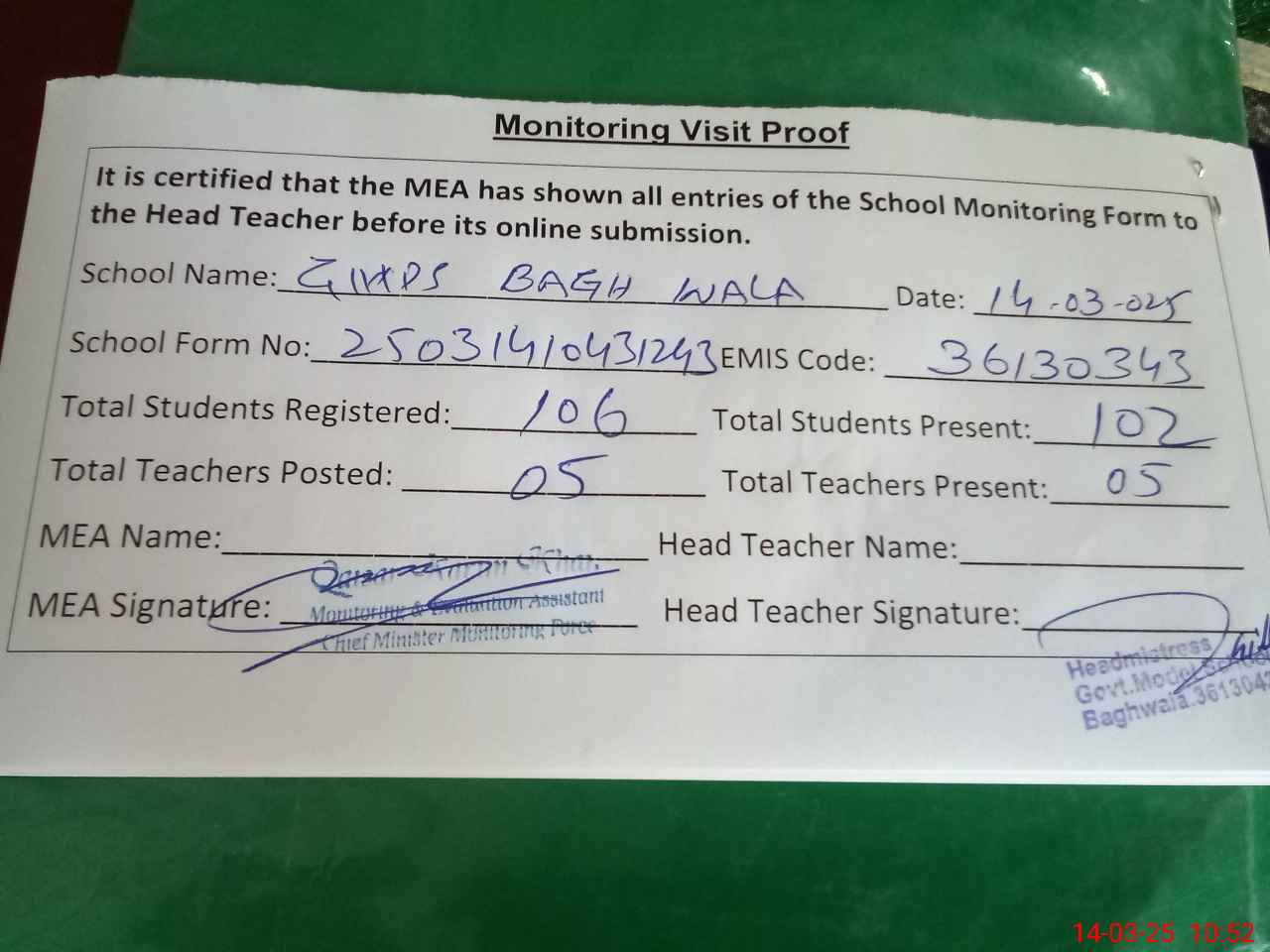 | EMIS Code: 36130343 | Name of School: GMPS BAGH WALA NEAR B Z UNIVERSITY | |||
