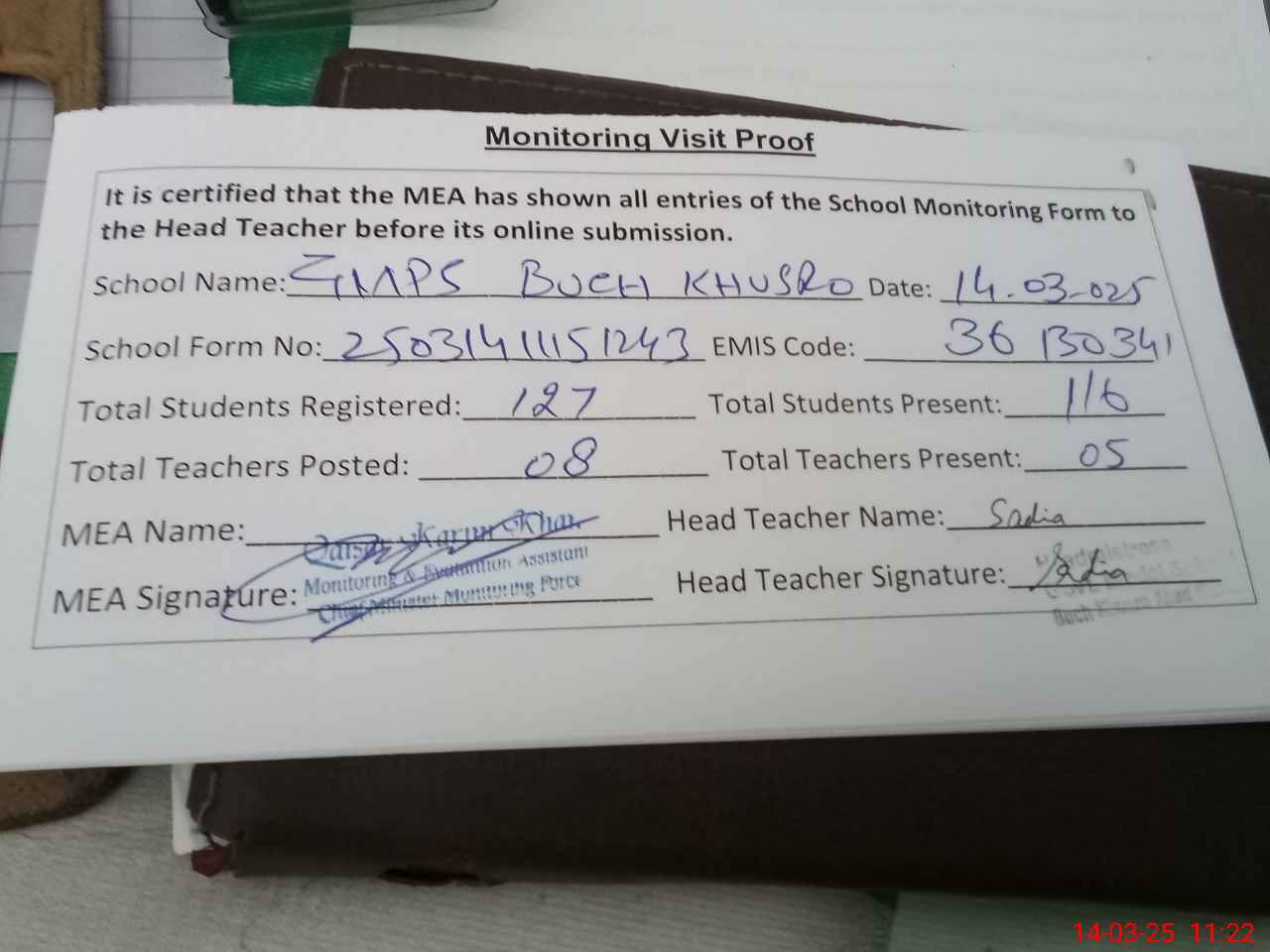 | EMIS Code: 36130341 | Name of School: GMPS BUCH KHUSRO ABAD BOSAN ROAD MULTAN | |||