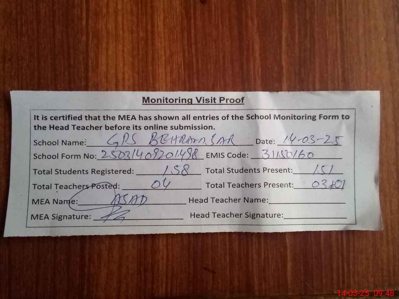 | EMIS Code: 31150160 | Name of School: GPS BEHRAAM SAR | |||