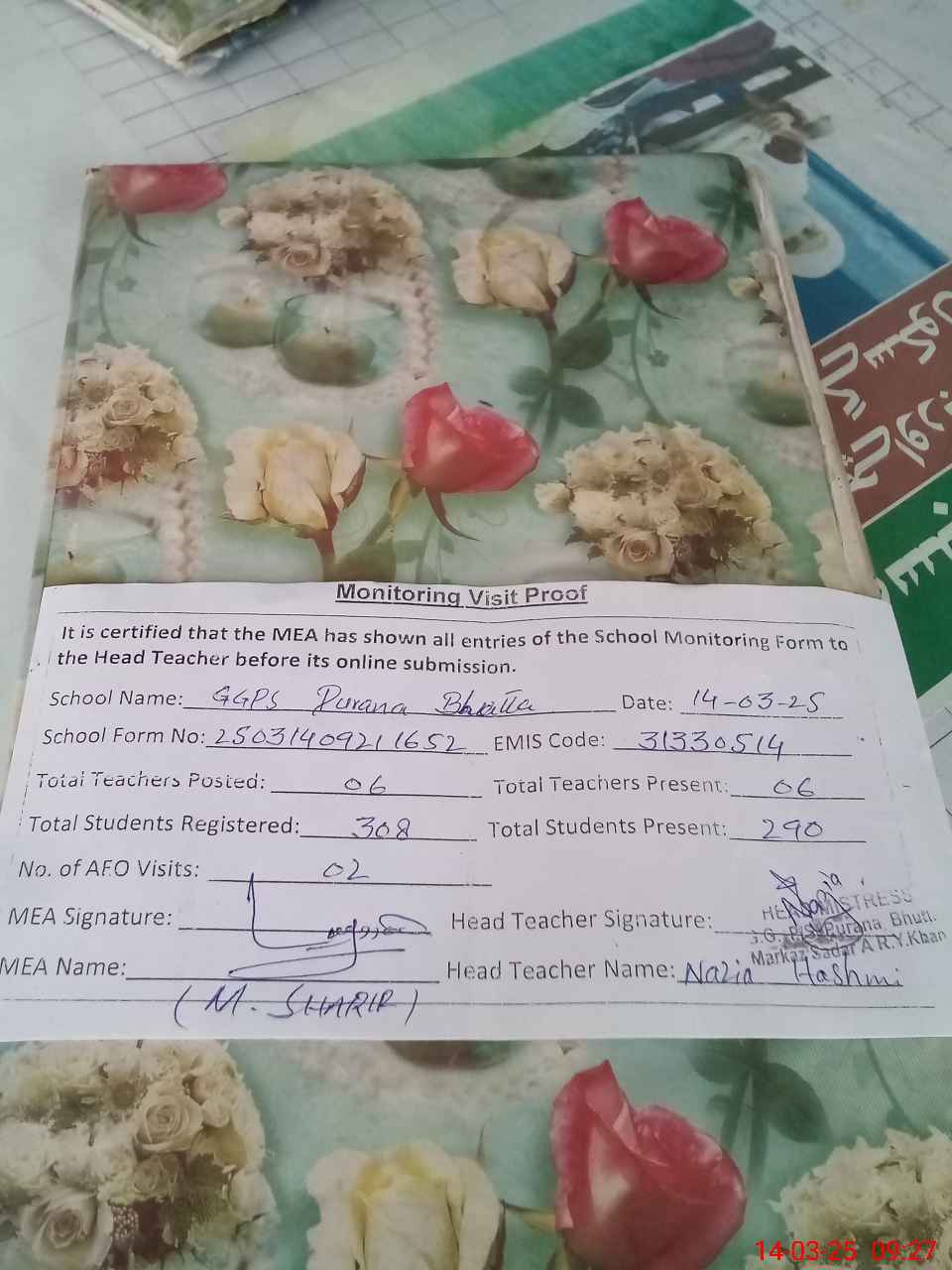 | Attendance Register | Head Teacher | MEA with School | Visit Proof |