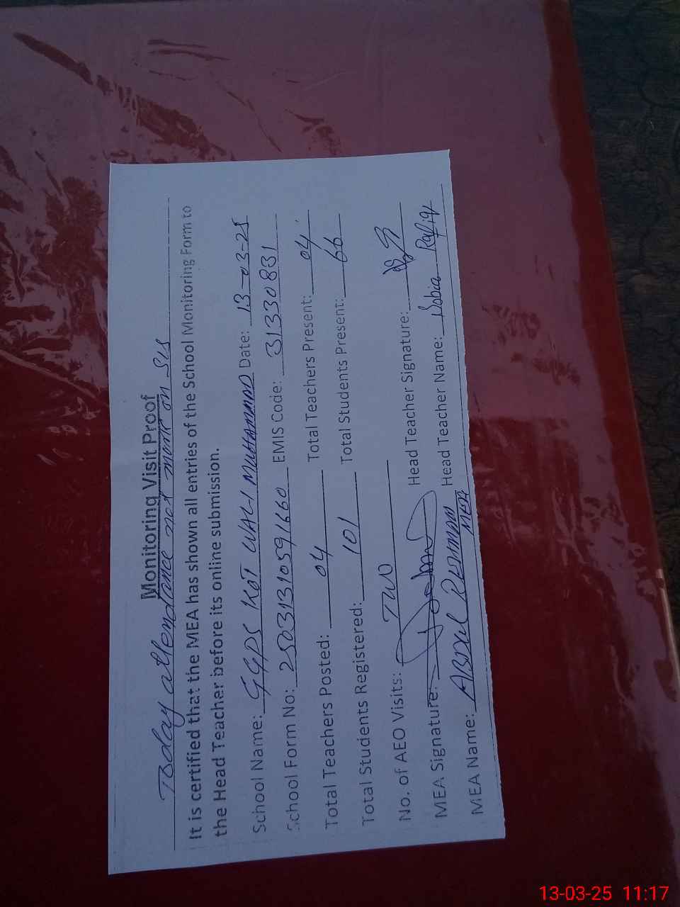 | Attendance Register | Head Teacher | MEA with School | Visit Proof |