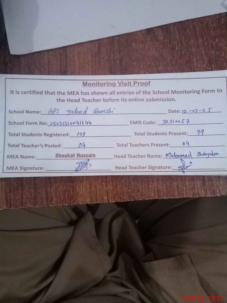 | EMIS Code: 32310057 | Name of School: GPS JADEED QURESHI | |||