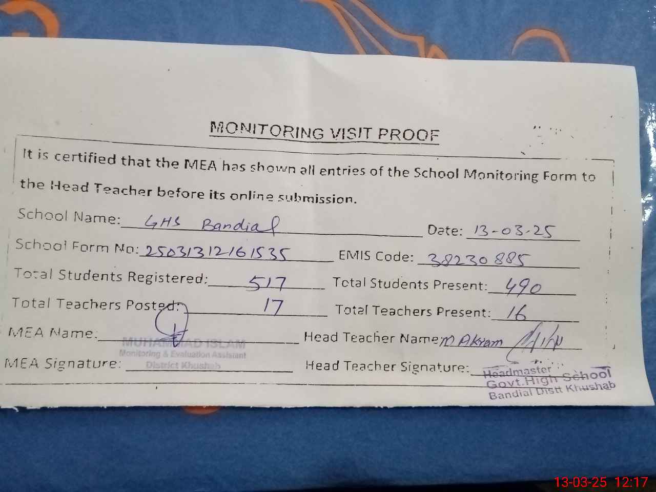 | EMIS Code: 38230885 | Name of School: GHS BANDIAL | |||