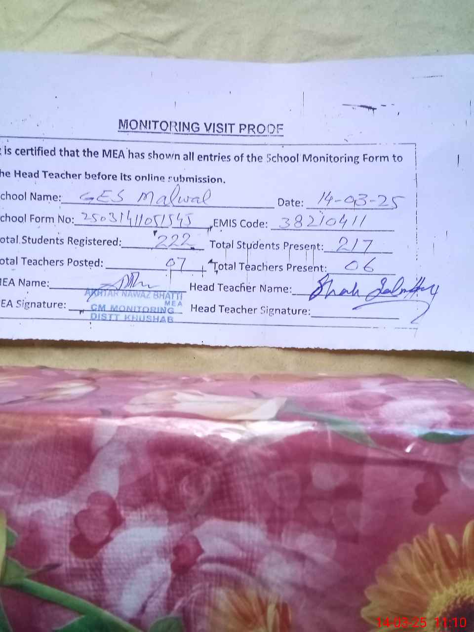 | Certified that this School was Inspected by the Undersigned MEA/DMO Today and the Information Stated Above is as Per Record. | |||||