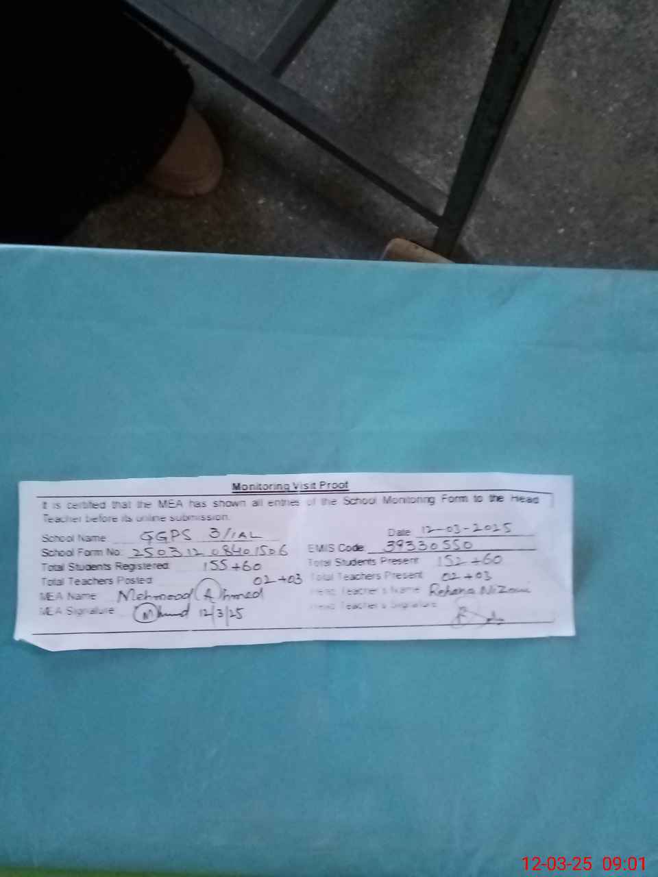 | Attendance Register | Head Teacher | MEA with School | Visit Proof |