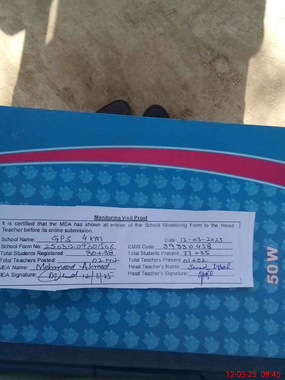 | EMIS Code: 39330458 | Name of School: GPS CHAK NO. 4 KM | |||