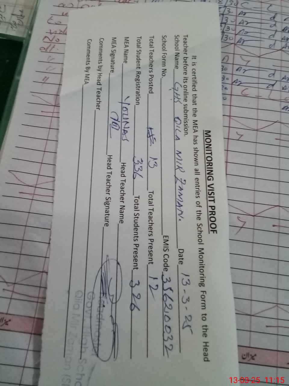 | Attendance Register | Head Teacher | MEA with School | Visit Proof |