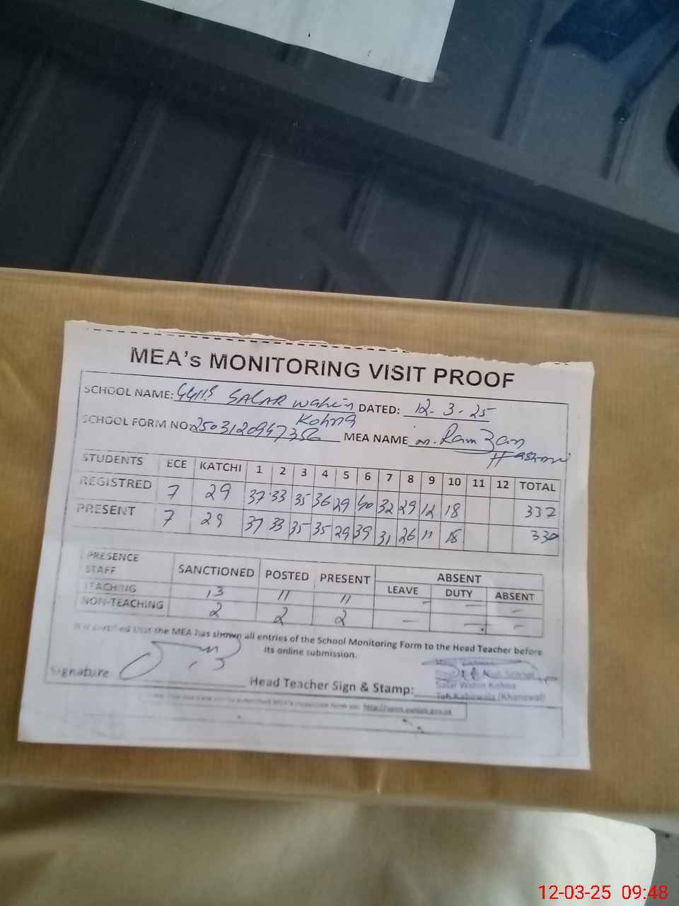 | Attendance Register | Head Teacher | MEA with School | Visit Proof |