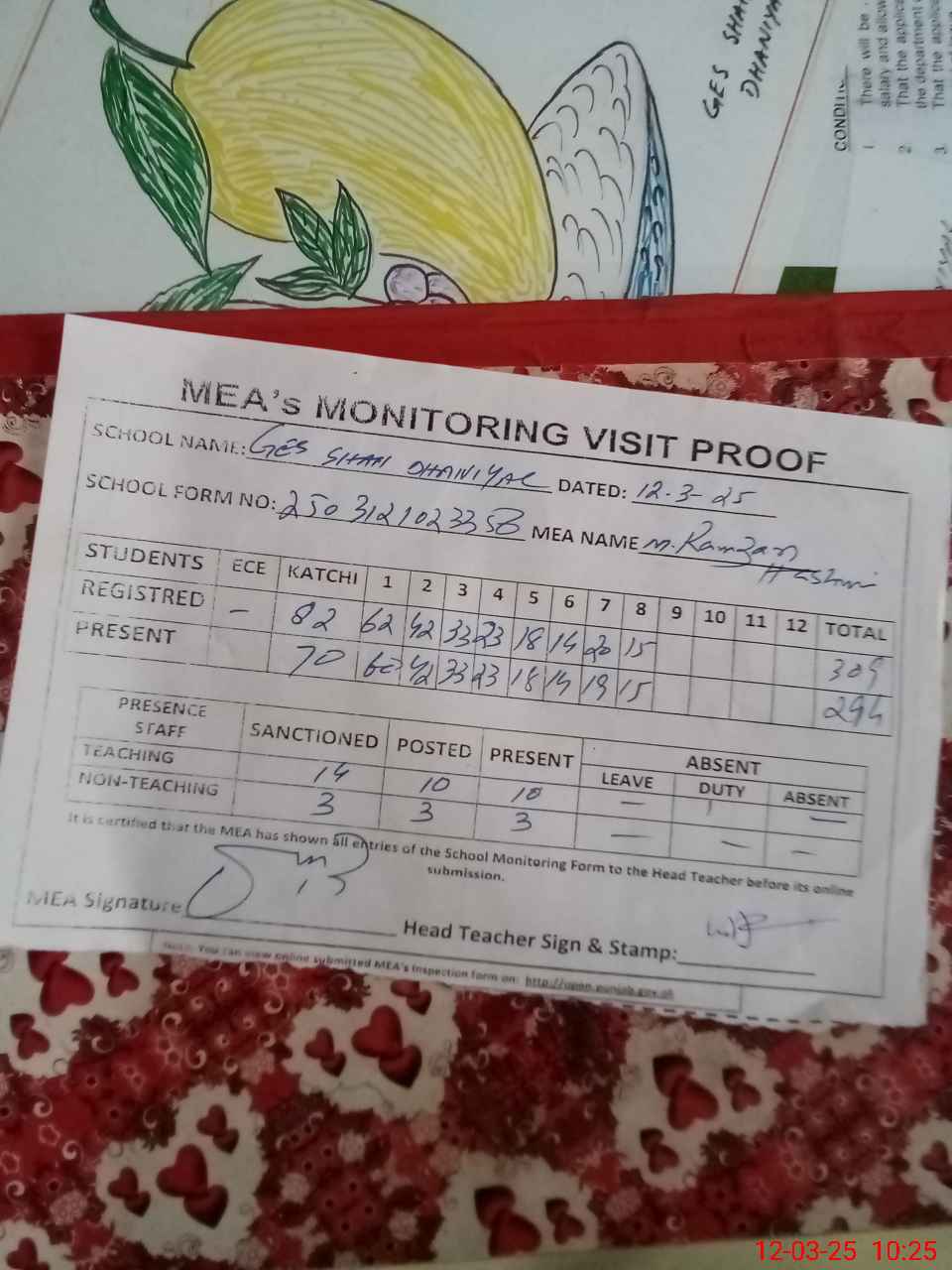 | Certified that this School was Inspected by the Undersigned MEA/DMO Today and the Information Stated Above is as Per Record. | |||||