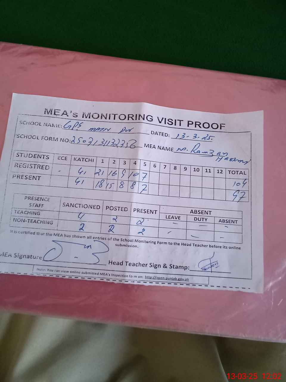 | Attendance Register | Head Teacher | MEA with School | Visit Proof |