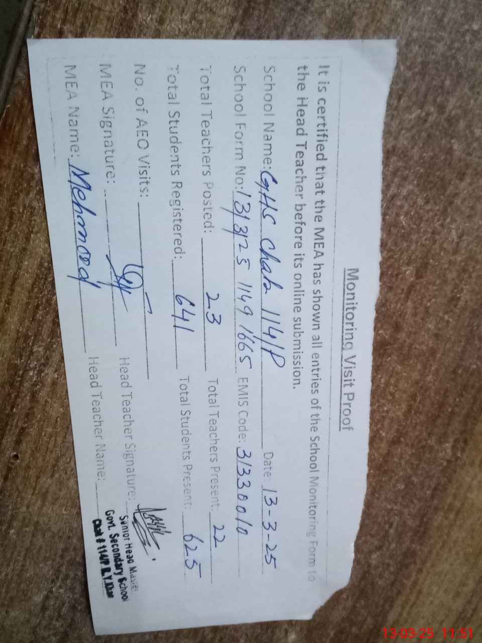| Attendance Register | Head Teacher | MEA with School | Visit Proof |