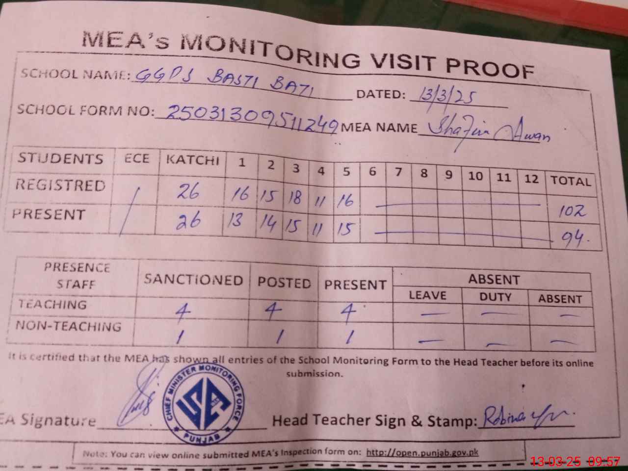 | Attendance Register | Head Teacher | MEA with School | Visit Proof |