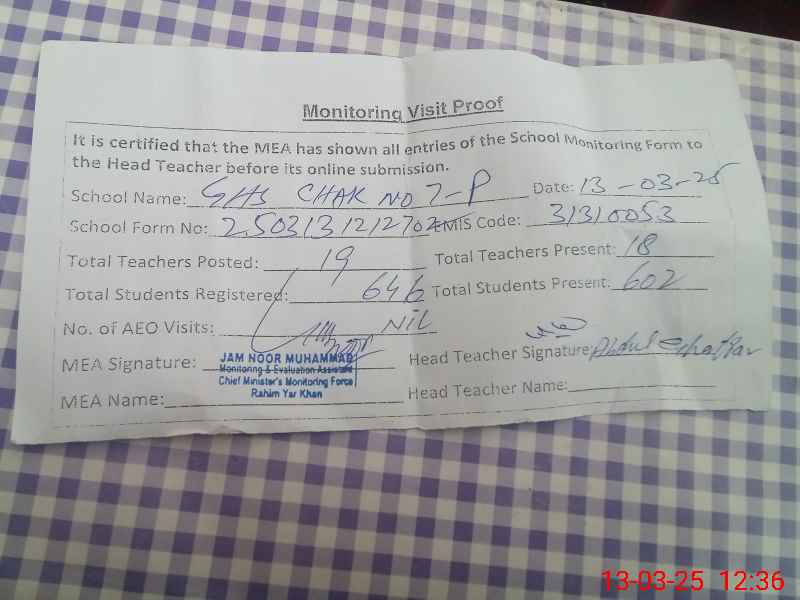 | EMIS Code: 31310053 | Name of School: GHS CHAK NO 7/P KHANPUR | |||