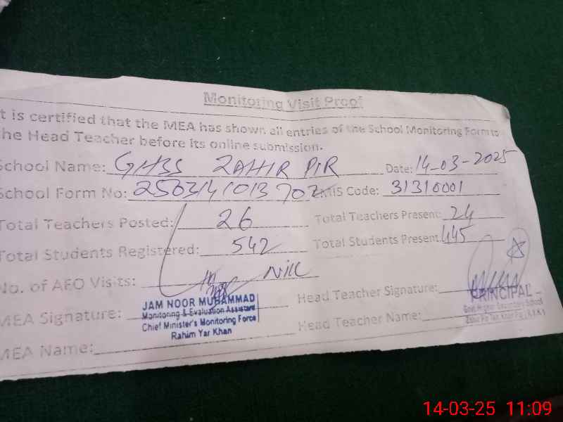 | EMIS Code: 31310001 | Name of School: GHSS ZAHIR PEER | |||