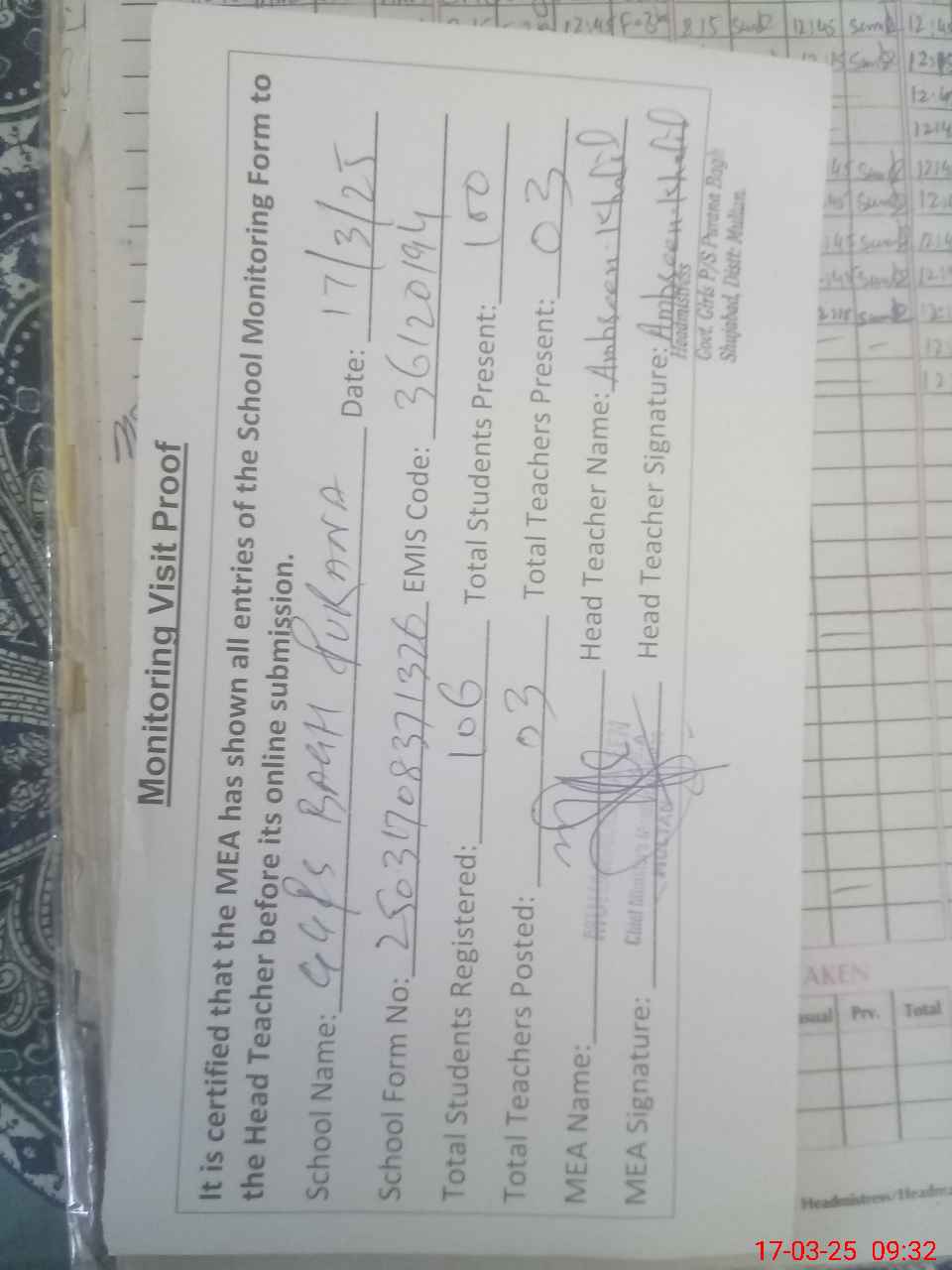| Attendance Register | Head Teacher | MEA with School | Visit Proof |