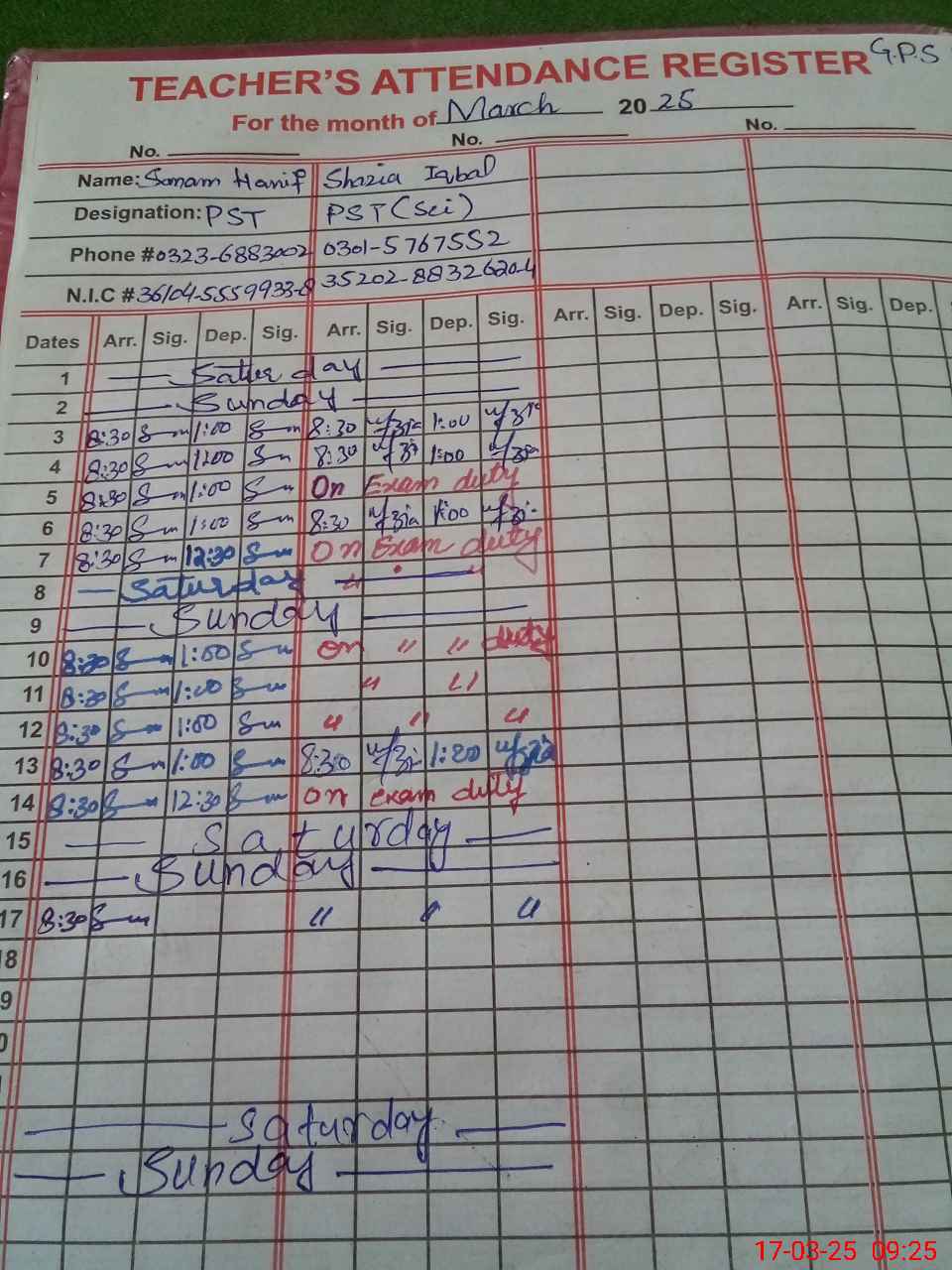 | 35**** | Sh**** Iq**** | PST | Regular | 0 | 0 | 0 | 0 | 0 | 0 | 0 | 0 | 0 | Exam Duty |