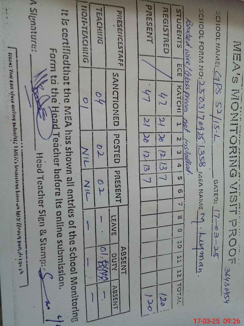 | Attendance Register | Head Teacher | MEA with School | Visit Proof |