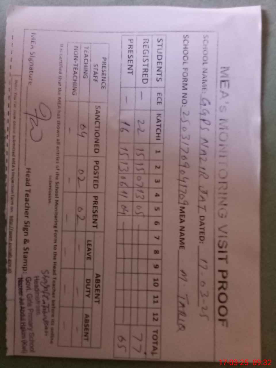 | Attendance Register | Head Teacher | MEA with School | Visit Proof |