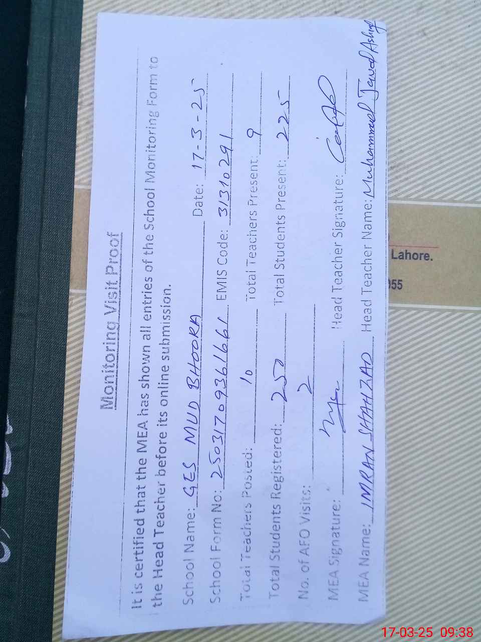 | Attendance Register | Head Teacher | MEA with School | Visit Proof |
