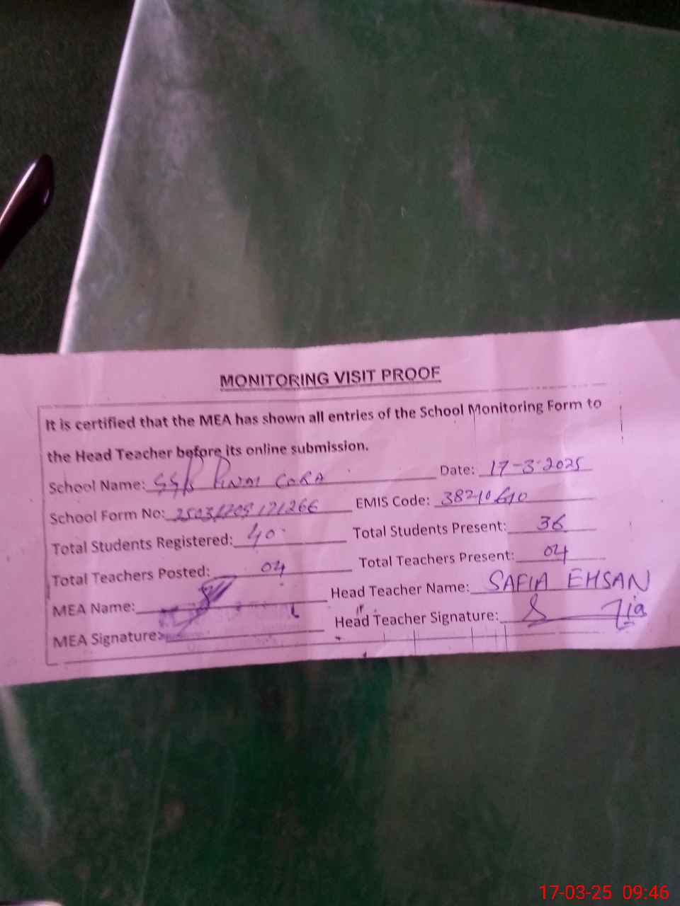 | Attendance Register | Head Teacher | MEA with School | Visit Proof |