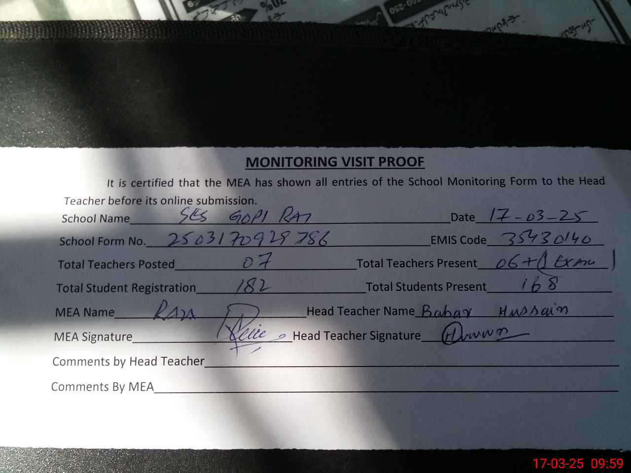 | Attendance Register | Head Teacher | MEA with School | Visit Proof |