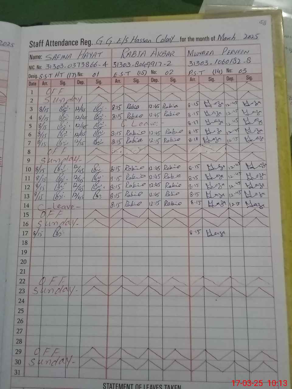 | CNIC | Full Name | Designation | R/C | Absence during last cal. month |