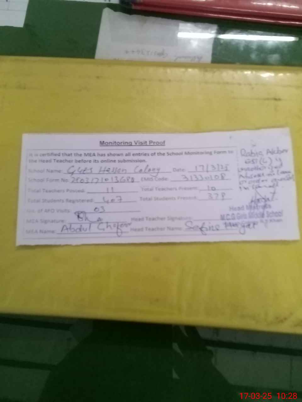 | Attendance Register | Head Teacher | MEA with School | Visit Proof |