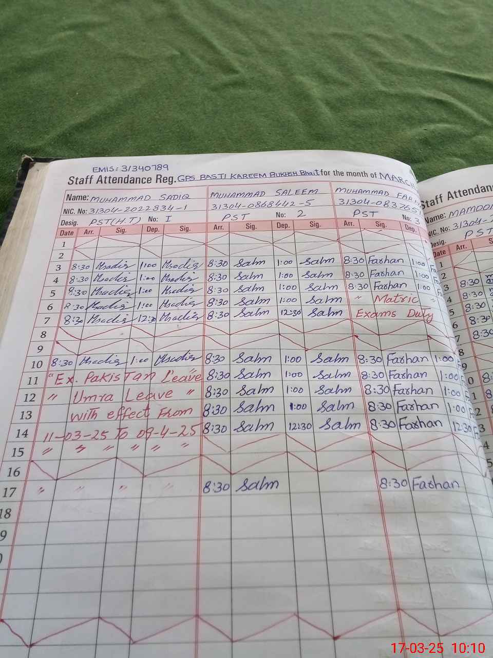 | CNIC | Full Name | Designation | R/C | Absence During Last Calender Month |