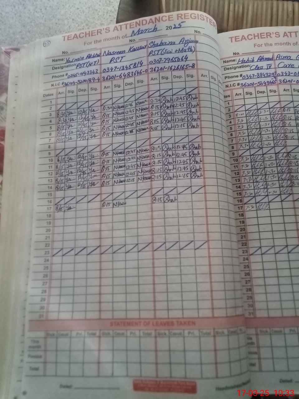 | CNIC | Full Name | Designation | R/C | Absence During Last Calender Month |