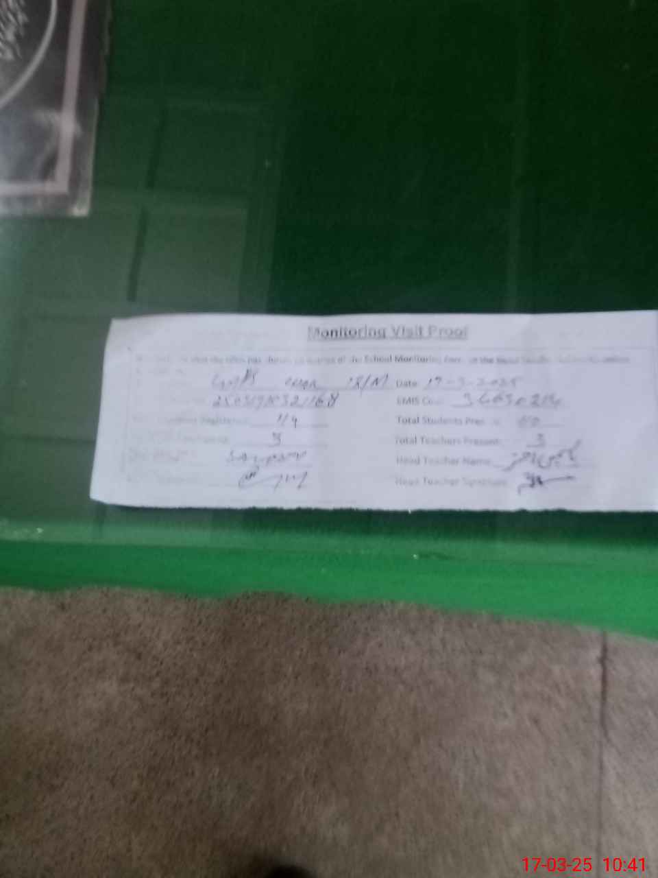 | Attendance Register | Head Teacher | MEA with School | Visit Proof |