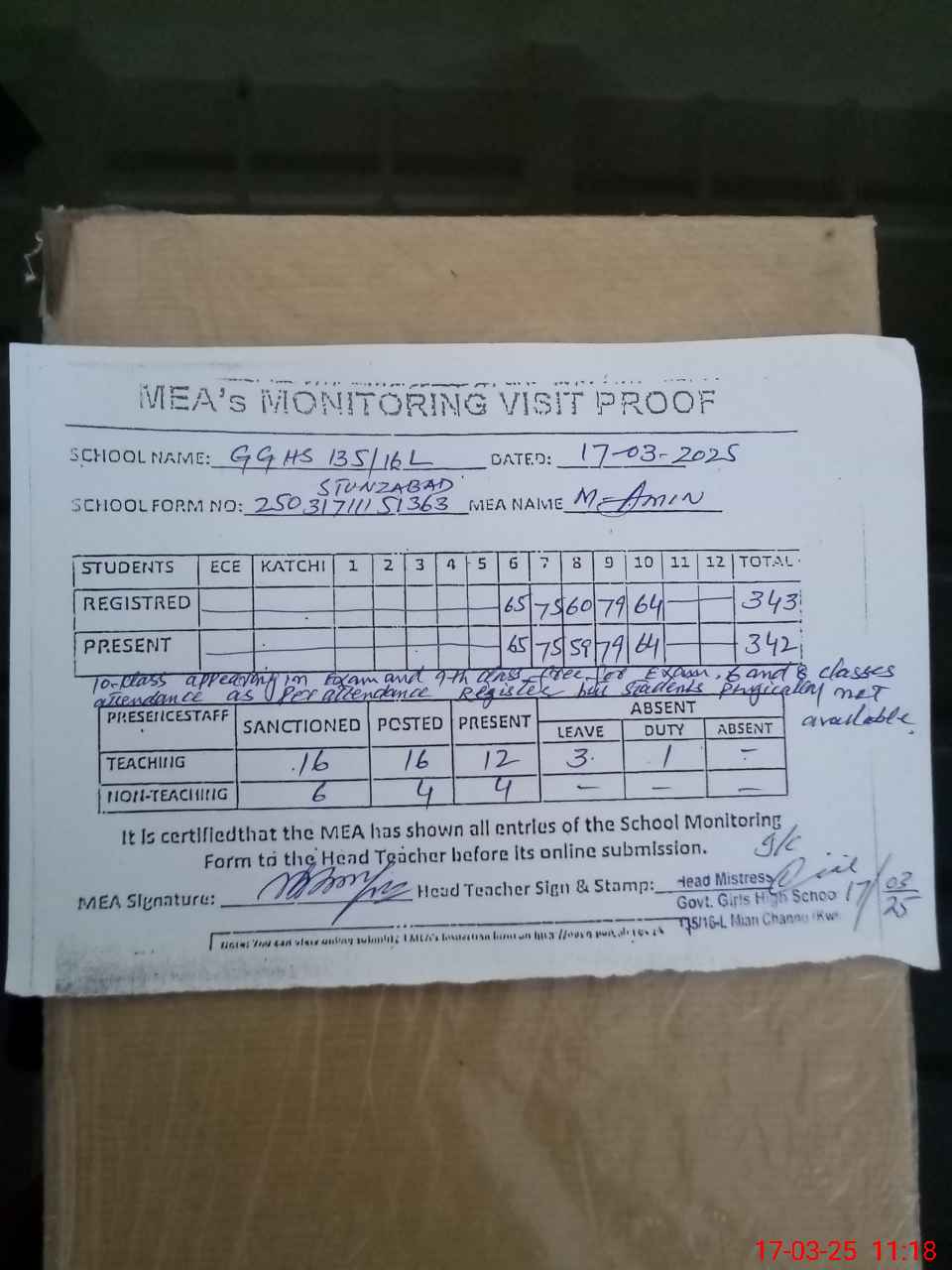 | Attendance Register | Head Teacher | MEA with School | Visit Proof |