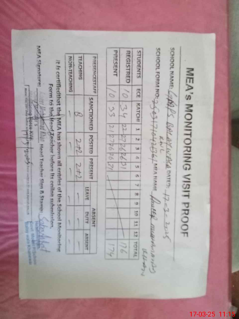 | Attendance Register | Head Teacher | MEA with School | Visit Proof |