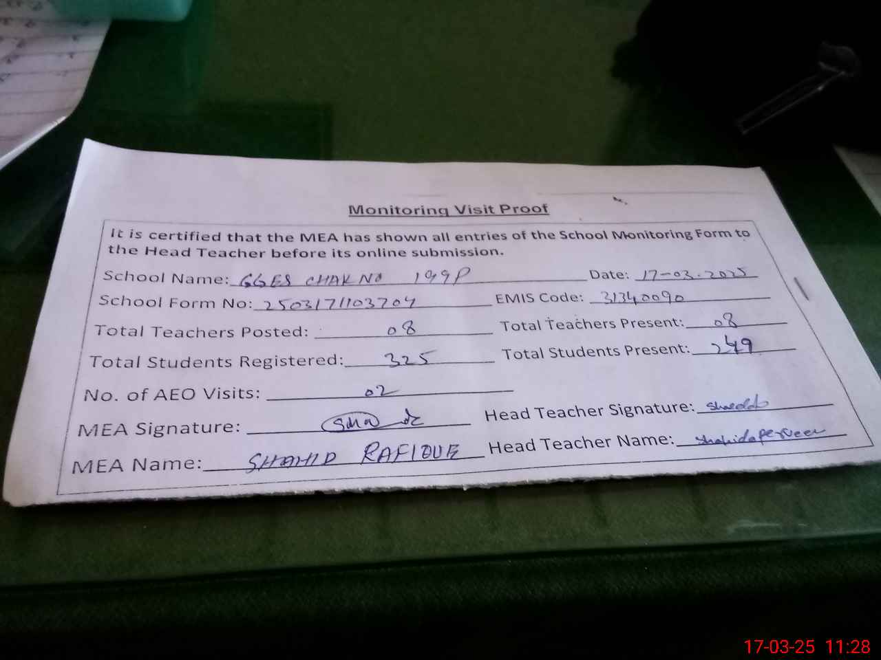 | Attendance Register | Head Teacher | MEA with School | Visit Proof |