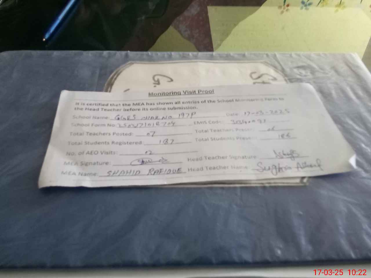 | Attendance Register | Head Teacher | MEA with School | Visit Proof |