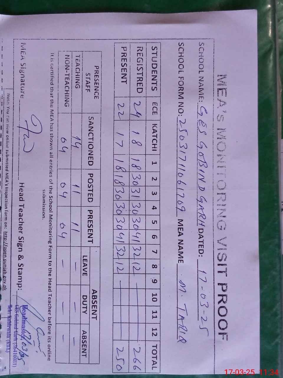 | Attendance Register | Head Teacher | MEA with School | Visit Proof |